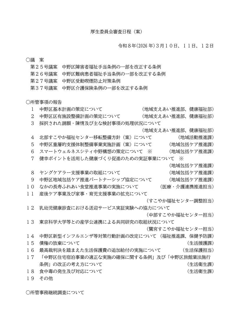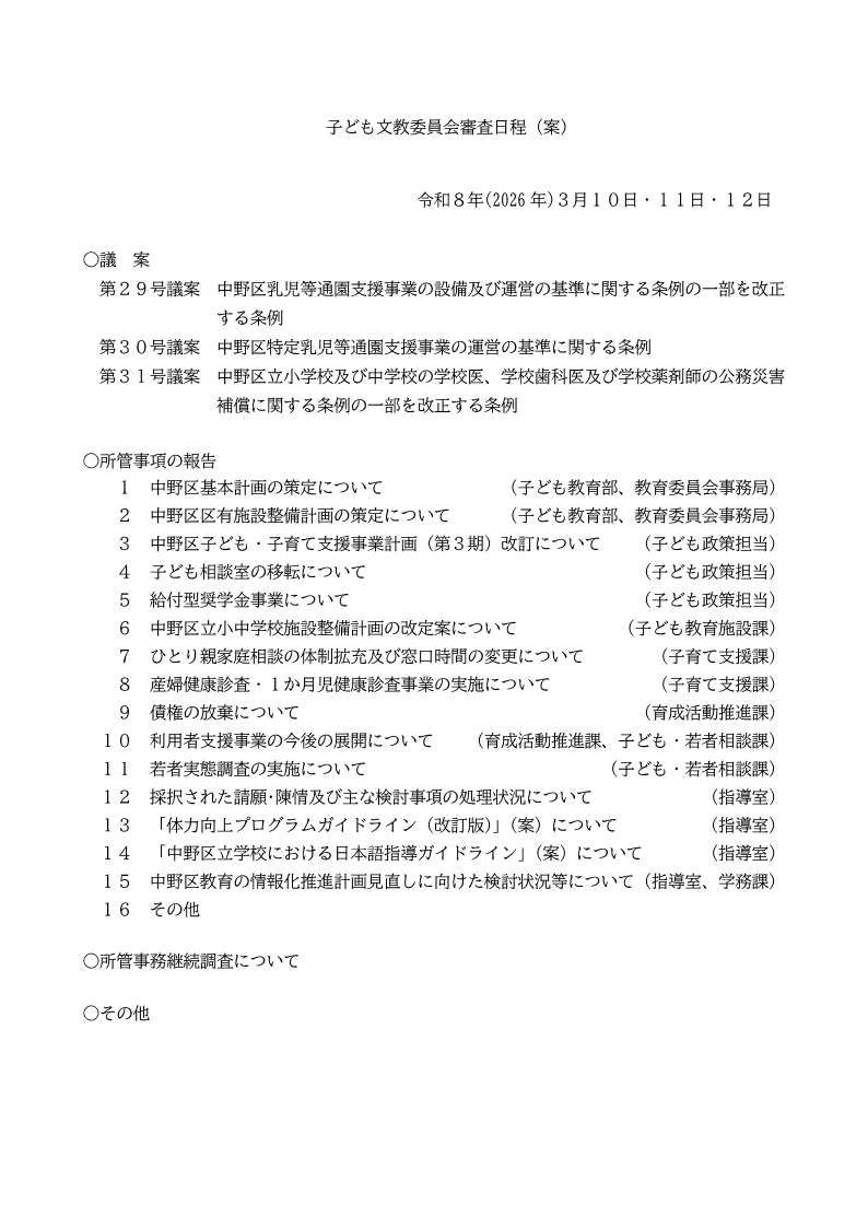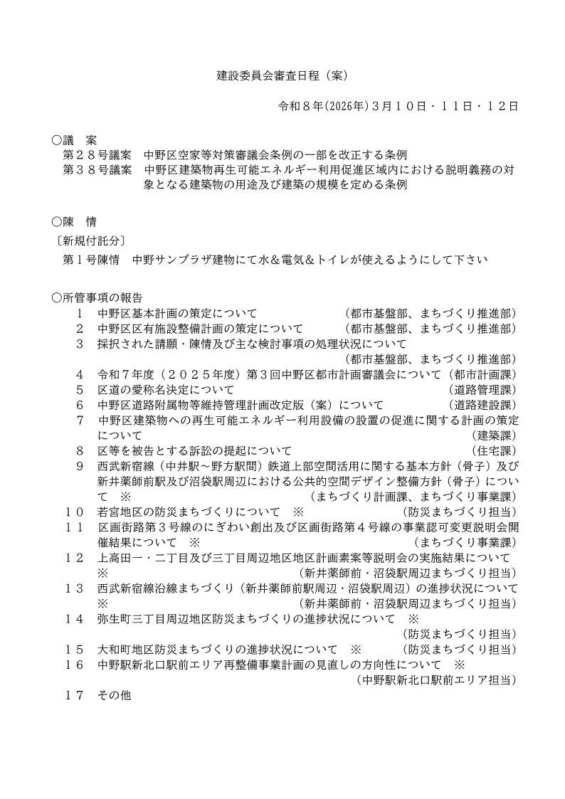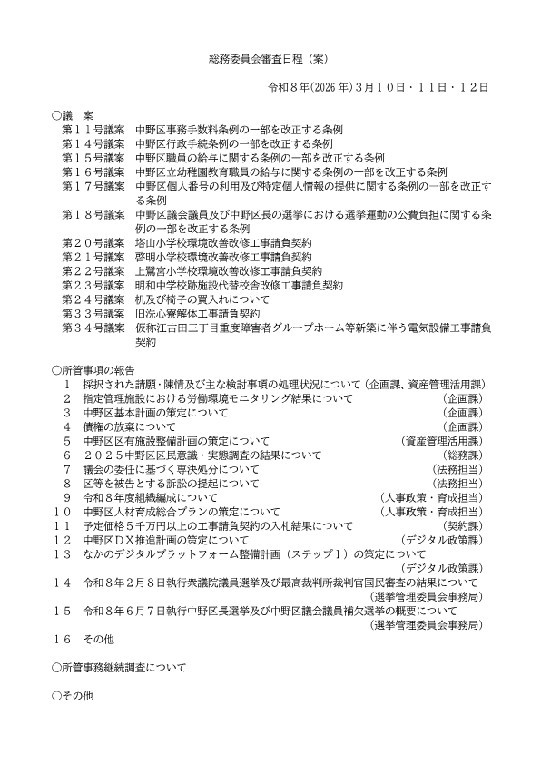 3/10~3/12に開会予定の常任委員会(総務・区民・厚生・建設・子ども文教)の審査日程案をお知らせします。内容は変更の可能性があります。